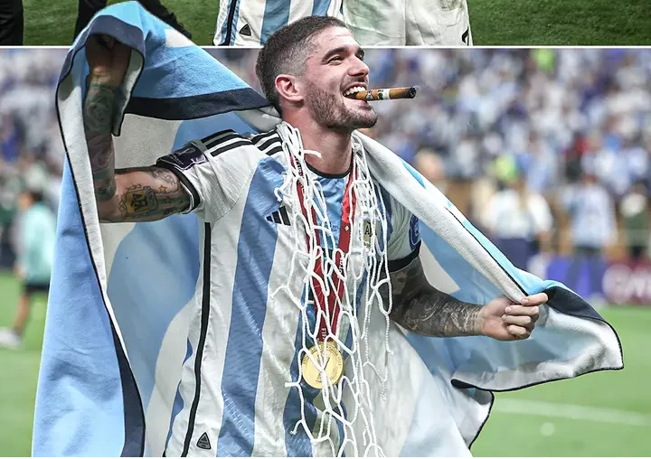 After winning the 2022 FIFA World Cup title ahead of France on Sunday, Argentina's midfielder, Rodrigo de Paul was spotted celebrating with a cigar in his mouth at the Lusail Iconic Stadium in Qatar.