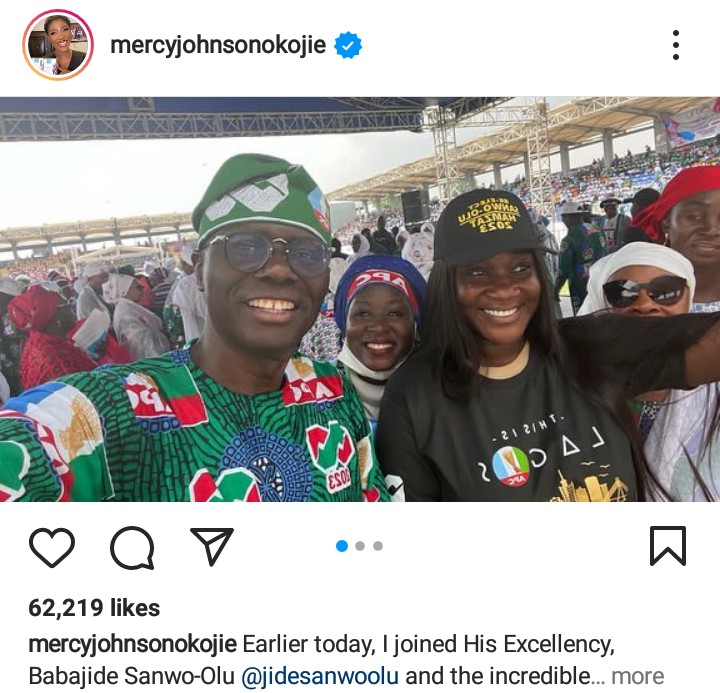 "Earlier today, I joined His Excellency, Babajide Sanwo-Olu @jidesanwoolu and the incredible women leaders that make up the APC ‘Women Presidential Campaign Team’ at the APC women Southwest Rally.