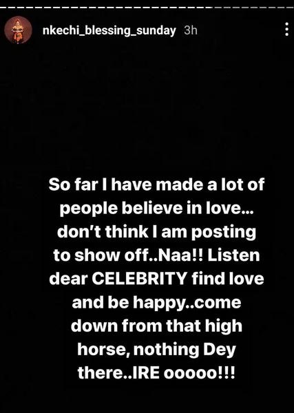 “So far I have made a lot of people believe in love… don’t think lam posting to show off..Naa!! Listen dear CELEBRITY find love and be happy..come down from that high horse, nothing Dey there..IRE ooooo!!!”