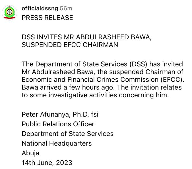 The suspended Chairman of the Economic and Financial Crimes Commission EFCC, Abdulrasheed Bawa, has been invited for questioning by the Department of State Services, DSS.
